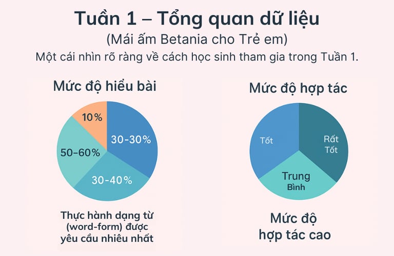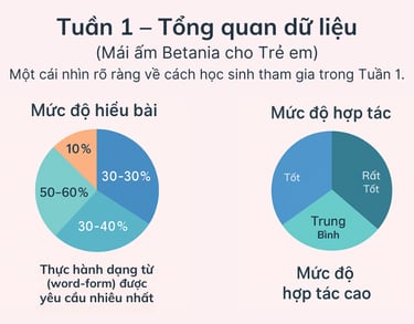 Một góc nhìn nhanh về cách các em tương tác với bài học Tuần 1 — đa số học sinh đã đạt mức hiểu bài vững vàng, và gần một phần ba đạt 90–100% mức độ nắm vững kiến thức sau khi được mentor hỗ trợ.